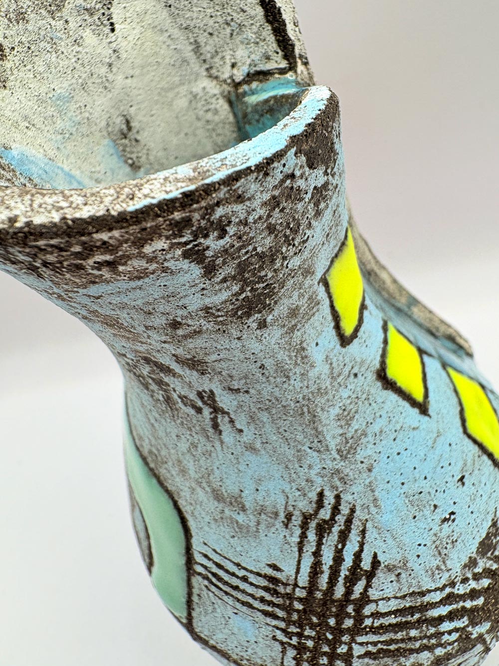 Unique textured contemporary vessel. Handbuilt from black stoneware clay and decorated with mark making, engobes and glazes.
