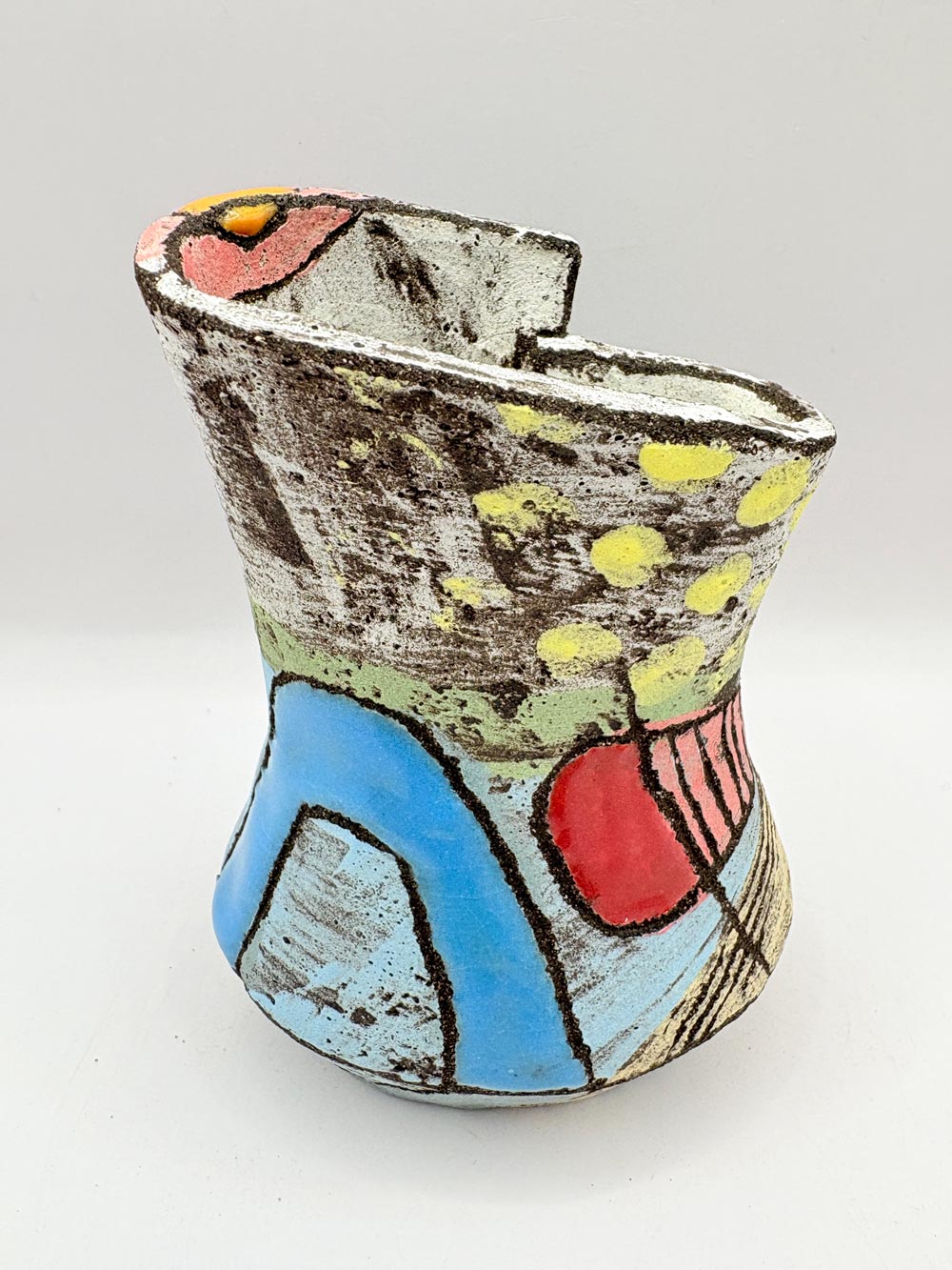 Unique textured contemporary vessel. Handbuilt from black stoneware clay and decorated with mark making, engobes and glazes.