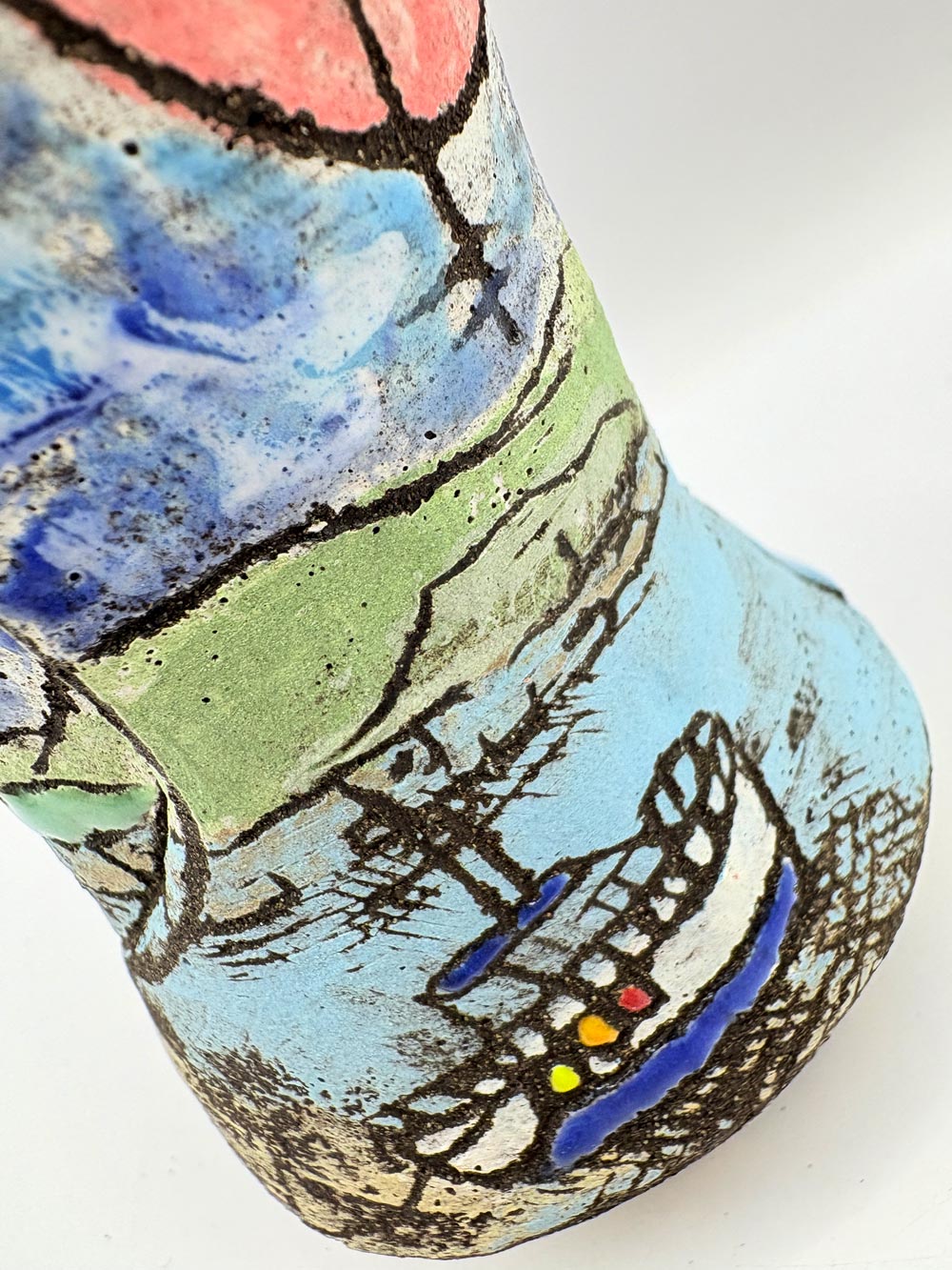 Small contemporary decorative vessel hand-built using black stoneware clay and painted with engobes and glazes. Heavily textured with use of mark making and layers to create a story or memory.