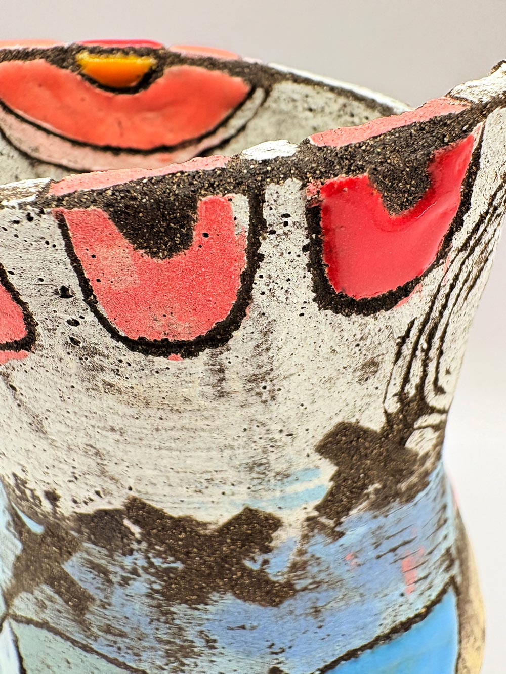 Contemporary decorative vessel with marks and textures. Decorated with engobes and glazes