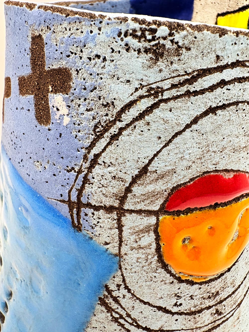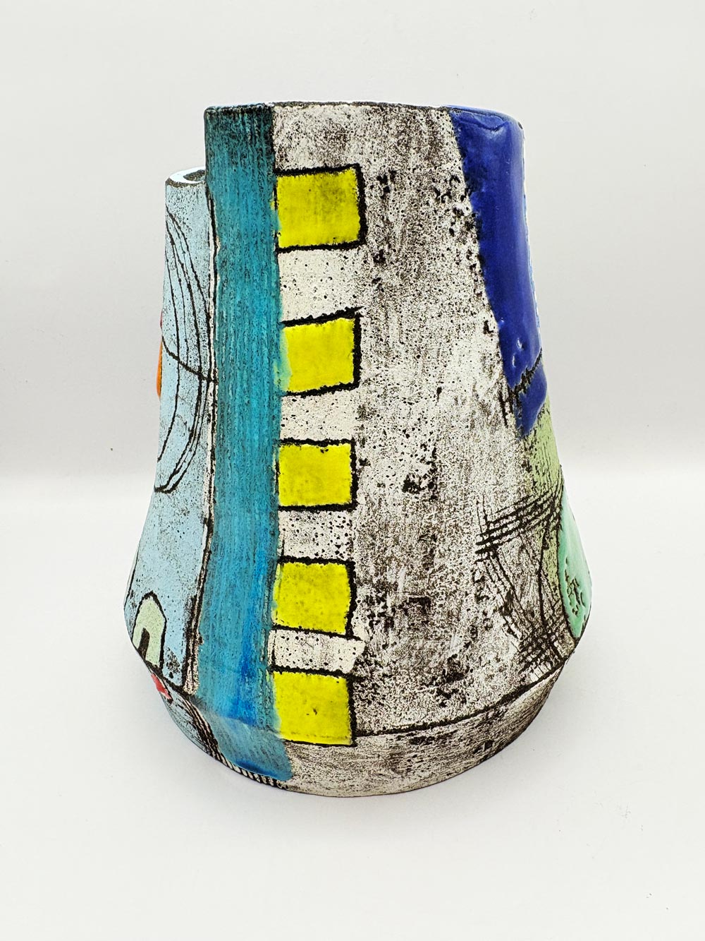 Small contemporary decorative vessel hand-built using black stoneware clay and painted with engobes and glazes. Heavily textured with use of mark making and layers to create a story or memory.